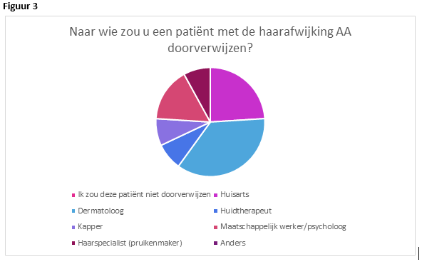 Uit een enquête die is gehouden onder mbo-professionals die met haar te maken krijgen in hun werk, is gebleken dat een groot deel wel eens een patiënt met AA in de praktijk is tegengekomen (figuur 1) (persoonlijke communicatie, Leloux, Schiks, 22-03-2018). Ook bleek dat veel deelnemers niet een duidelijk idee hadden wat ze voor een patiënt met AA kunnen beteken (figuur 2). Dat is te begrijpen, aangezien de behandelmogelijkheden voor mensen met AA beperkt zijn. Wat vooral belangrijk is, is dat je weet naar wie je iemand met (vermoedelijk) AA kunt doorsturen. Uit onze enquête bleek dat iedereen de patiënt wel door zou sturen en de keuzes daarvoor de huisarts, de dermatoloog, de huidtherapeut, de kapper, de maatschappelijk werker/psycholoog en de haarspecialist zouden zijn (figuur 3).