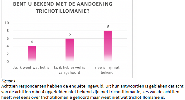 Uit de enquête blijkt dat het grootste gedeelte van de respondenten niet bekend is met de aandoening trichotillomanie, wat volgens mevrouw Hester komt doordat ze tijdens hun opleiding te weinig leren over haarafwijkingen trichotillomanie.